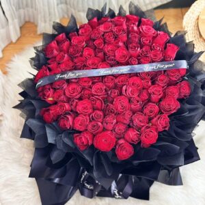 Large : A grand arrangement of 99 red roses, luxuriously wrapped in black paper with a “Just for You” ribbon accent