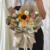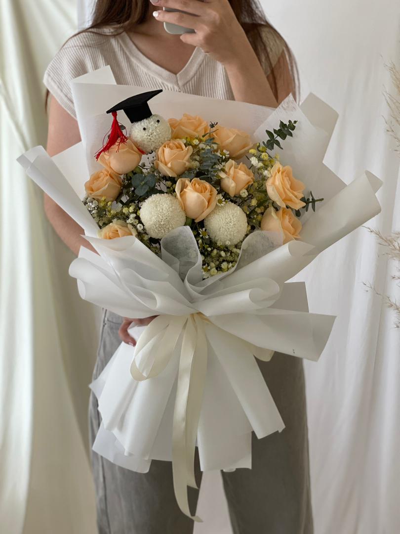 Large : White Button Chrysanthemums (3 stalks), Roses (10 stalks), Baby’s Breath & Eucalyptus