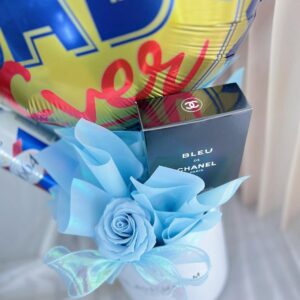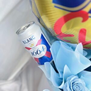For the dad who’s effortlessly stylish and forever your hero – “Blue Elegance for Dad” is a luxe gift box that blends charm, class, and celebration. It features a soft soap flower blue rose arrangement, a can of 1664 Blanc beer, and a bottle of Bleu de Chanel – all tied together with an iridescent ribbon and crowned with a cheerful “Best Dad Ever” balloon.