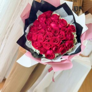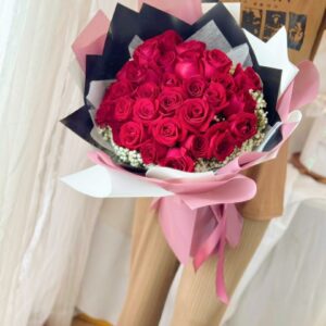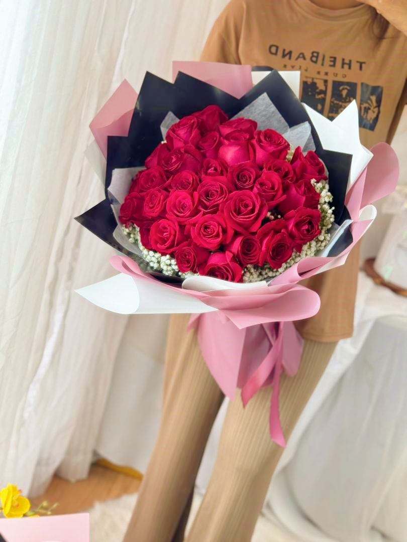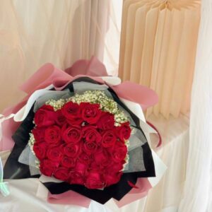 Large : Red roses accented with delicate baby’s breath, wrapped in elegant black, white, and pink layers, finished with a soft pink ribbon