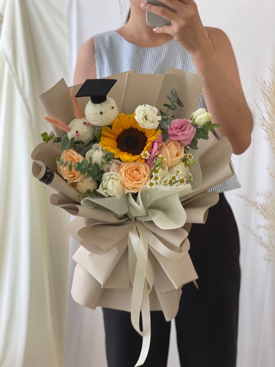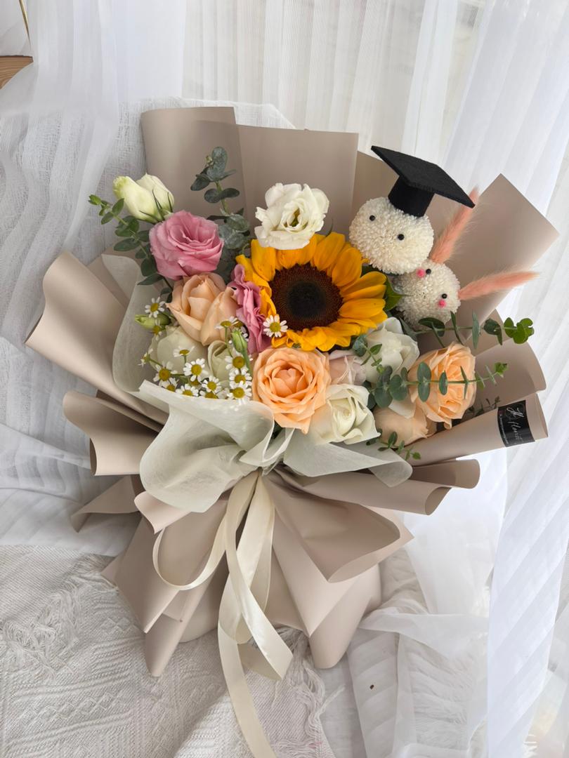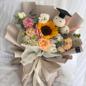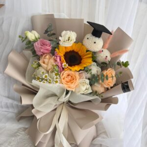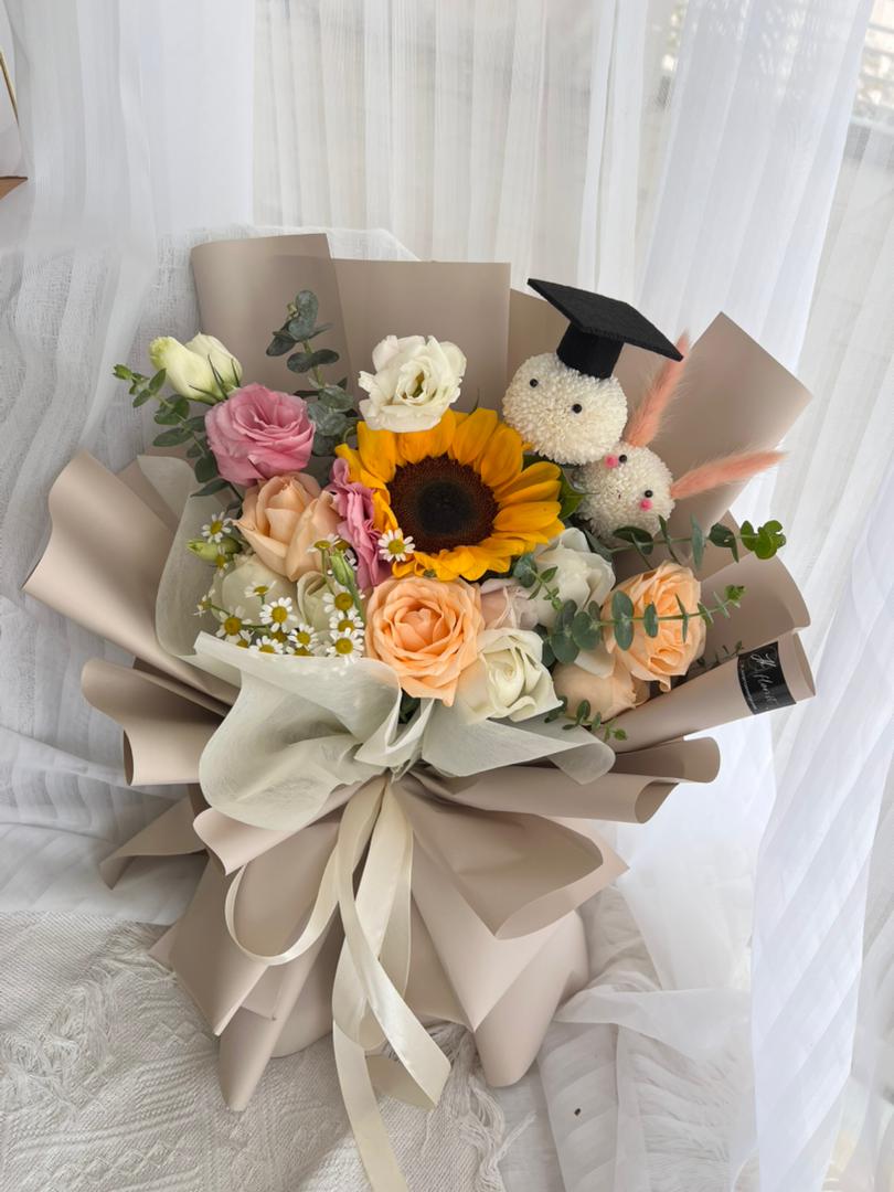 Large : Sunflower (1 stalk), Roses (10-11 stalks), Eustoma, Chamomile & Eucalyptus, Graduation Pom-Pom Bear with Cap