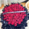 Large : Red and pink roses, encircled with baby’s breath, wrapped in soft blush paper and finished with a black ribbon and “Love is Eternal” band