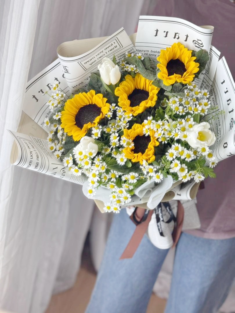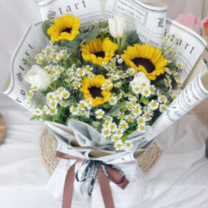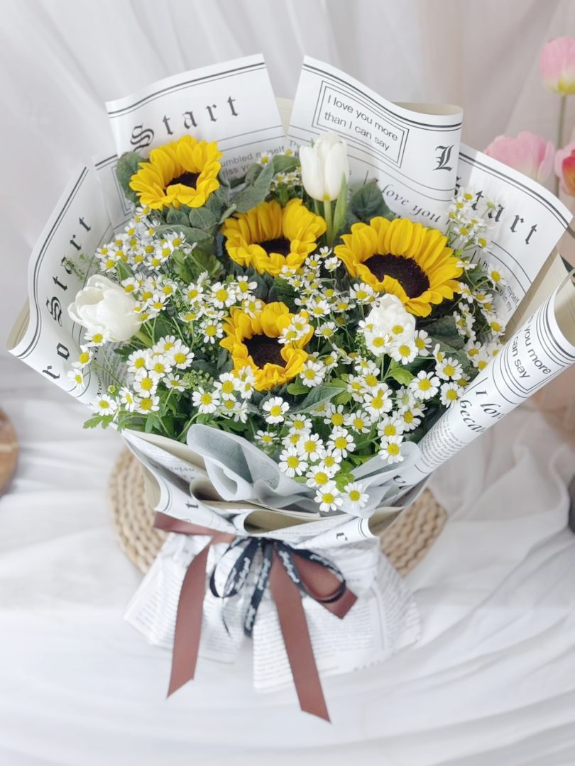 Large : Sunflower (4 stalks), Tulips (3 stalks), Chamomile, Eucalyptus