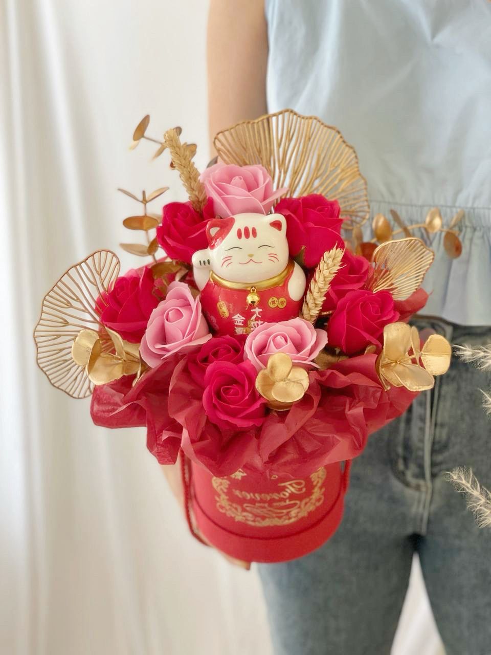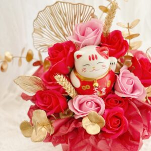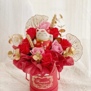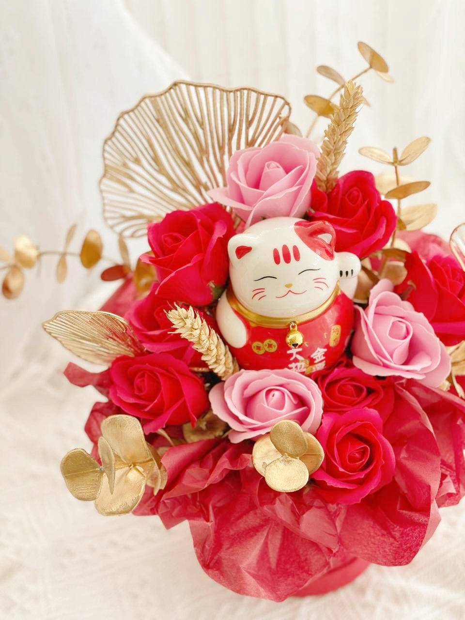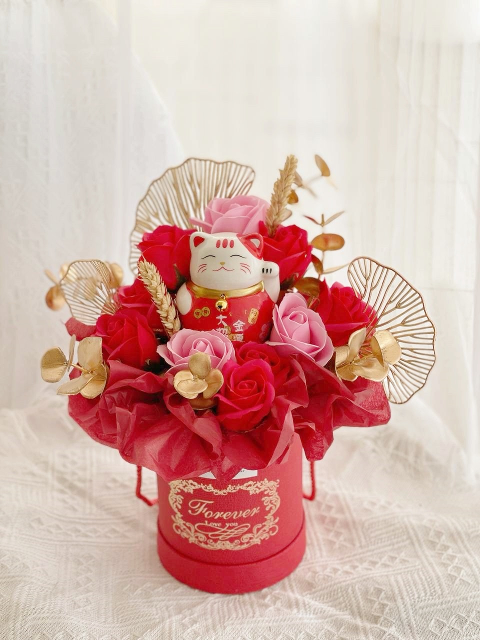 A radiant arrangement of red and pink roses paired with golden accents and delicate leaf decor, symbolizing love, luck, and prosperity. At its heart sits a cheerful Maneki-Neko lucky cat figurine, inviting wealth and positive energy. Nestled in a luxurious red round box with soft wrapping and fine golden touches, this design embodies the spirit of success and celebration — a perfect token of good fortune for any grand opening or joyous occasion.
