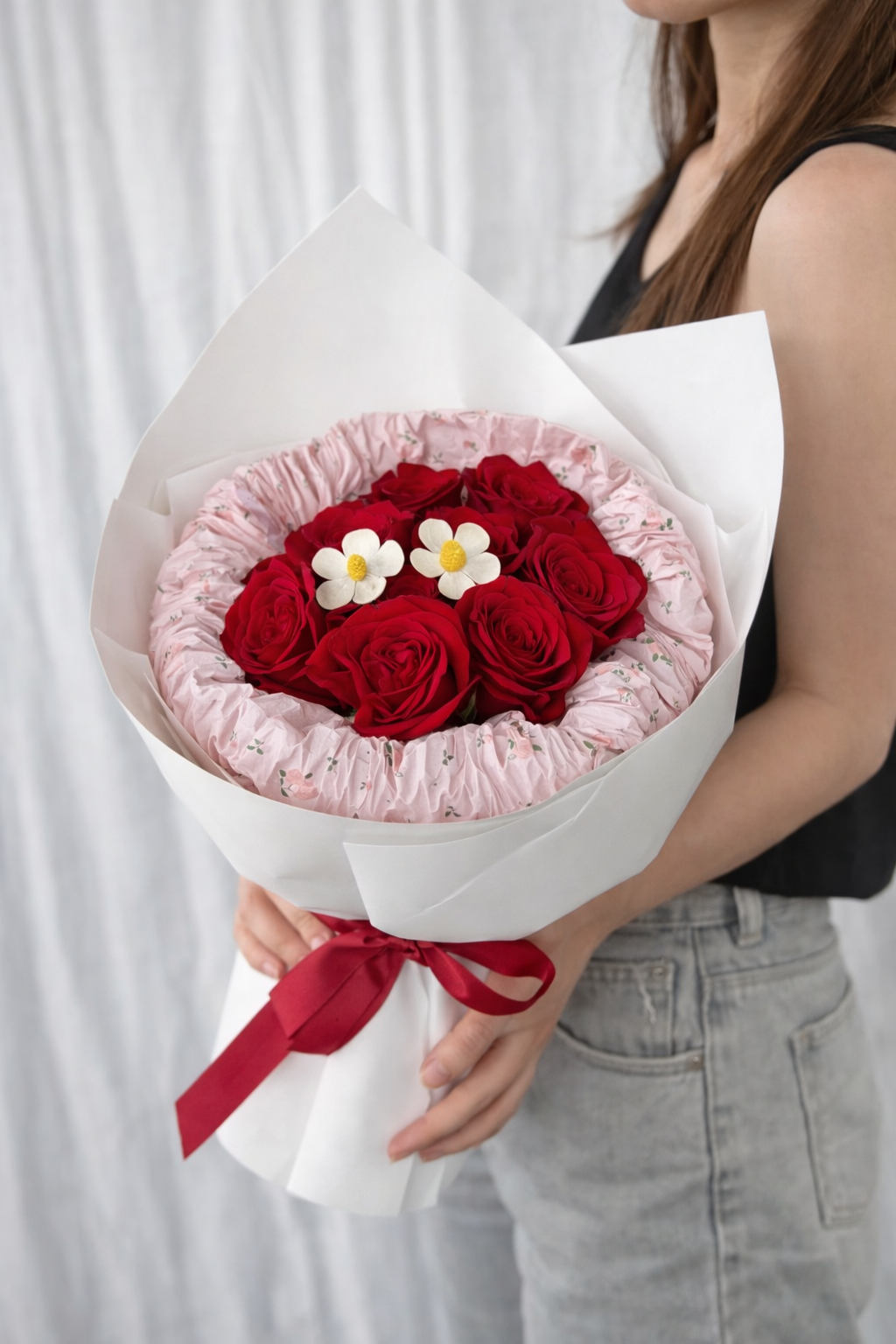 A striking bouquet of 8 red roses (FROM INDIA) accented with delicate fillers and wrapped in sleek white paper, finished with a marroon ribbon. Designed for those who love bold romance, this arrangement is perfect for Valentine’s Day, anniversaries, or making a confident statement of love.