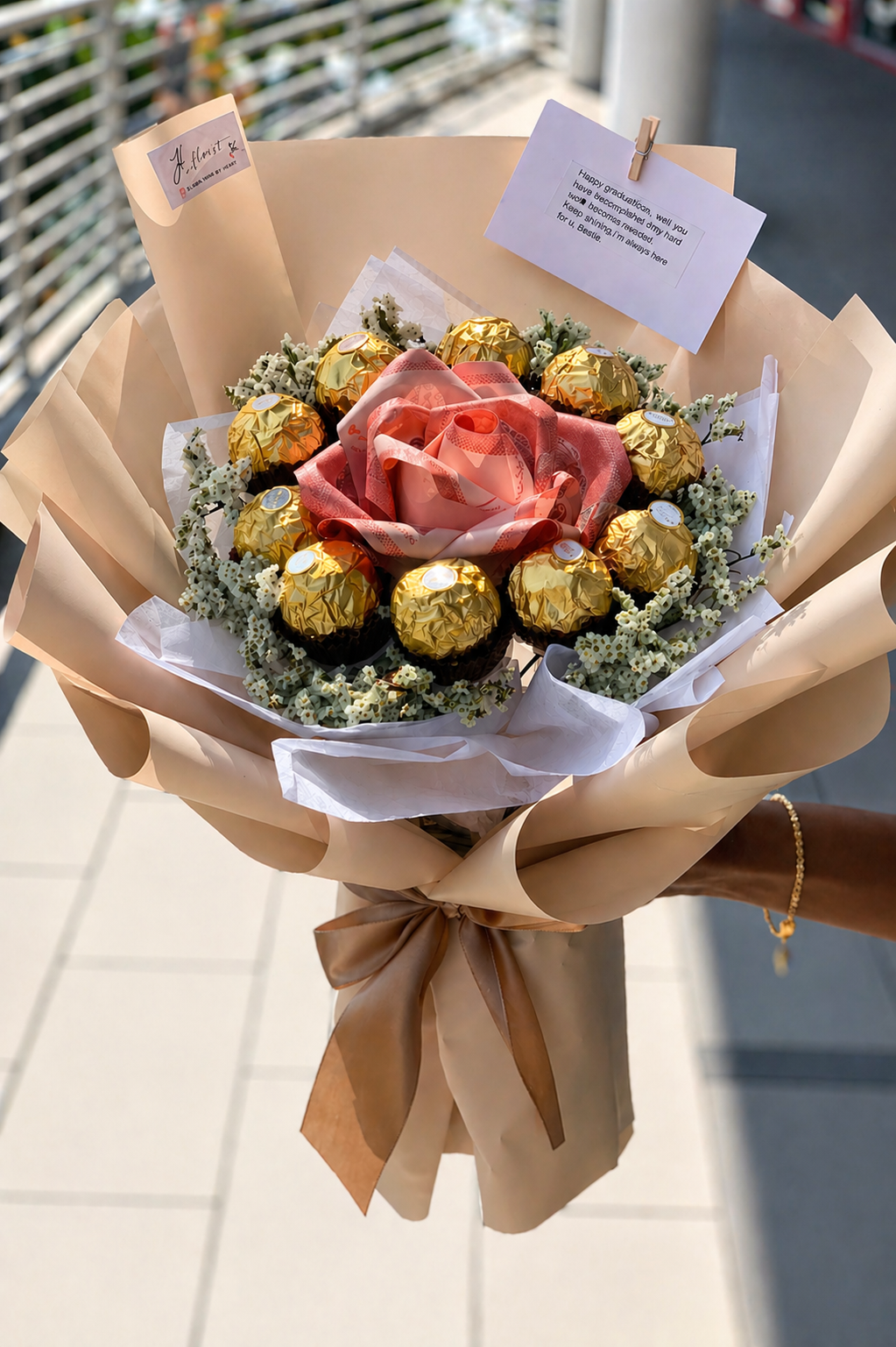 A soft, elegant bouquet designed to impress with its warm milk tea tones and luxurious touch. This arrangement features a beautifully crafted central rose, surrounded by premium Ferrero Rocher chocolates and delicate white baby’s breath, creating a perfect balance of sweetness and sophistication.