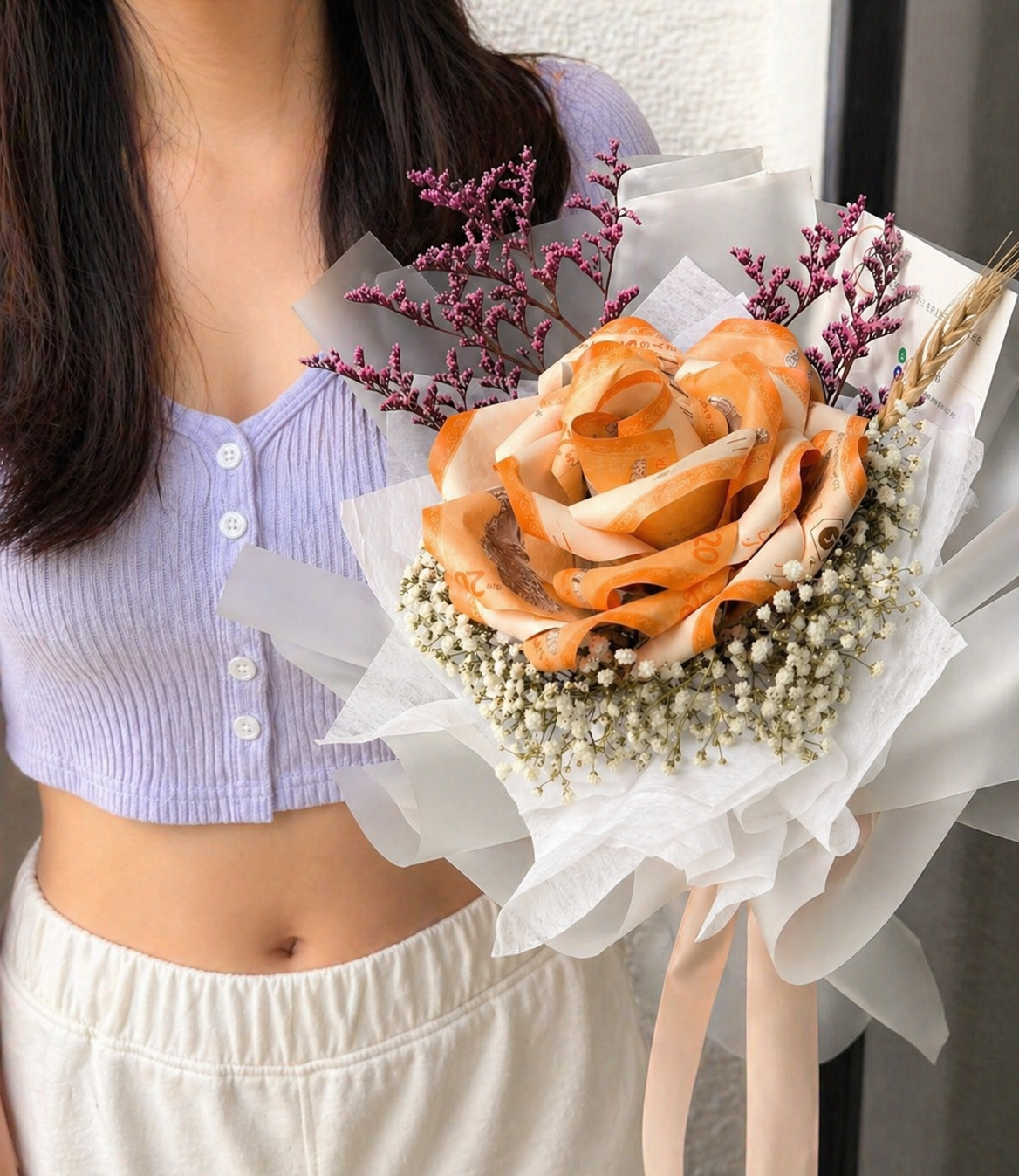 A luxurious twist on a classic rose — the Golden Bloom Money Rose Bouquet is crafted using elegantly folded RM notes shaped into a stunning rose centerpiece. Surrounded by delicate baby’s breath and soft premium wrapping, this bouquet symbolizes both love and prosperity.