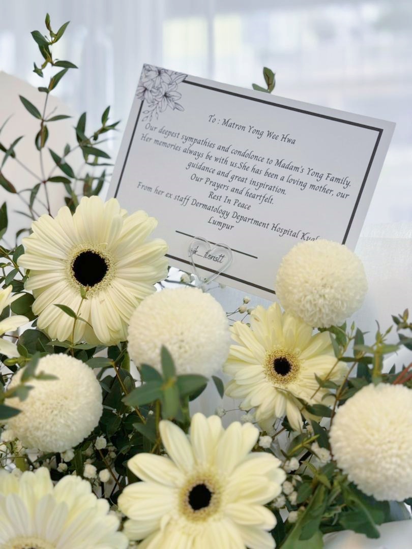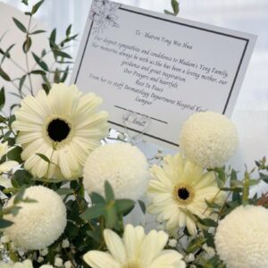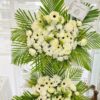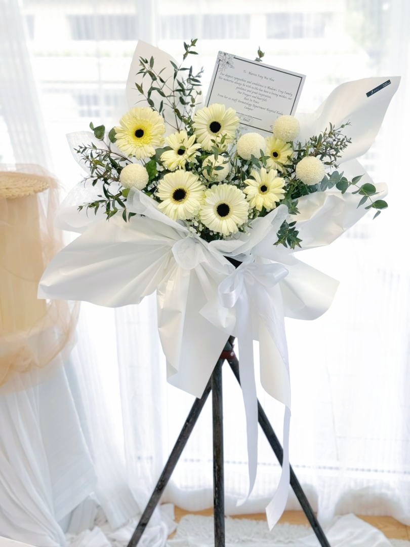 A gentle tribute of white gerberas and pompom chrysanthemums, symbolizing peace, purity, and everlasting love. Soft greenery flows through the arrangement, creating a serene balance of grace and comfort. Wrapped in crisp white papers and tied with an elegant satin ribbon, this condolences stand conveys heartfelt sympathy and quiet strength — a tender reminder of eternal peace and remembrance.