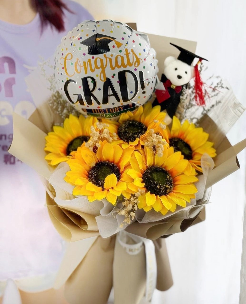 Medium : Sunflowers, Baby’s Breath Fillers, Graduation Teddy Bear, and a “Congrats Grad” Balloon