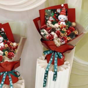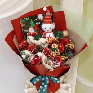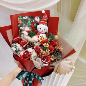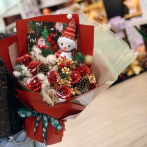 A festive Christmas bouquet featuring red soap flower roses, winter greenery, pinecones, and a charming snowman accent. Beautifully wrapped to create a warm, joyful holiday gift filled with Christmas magic.