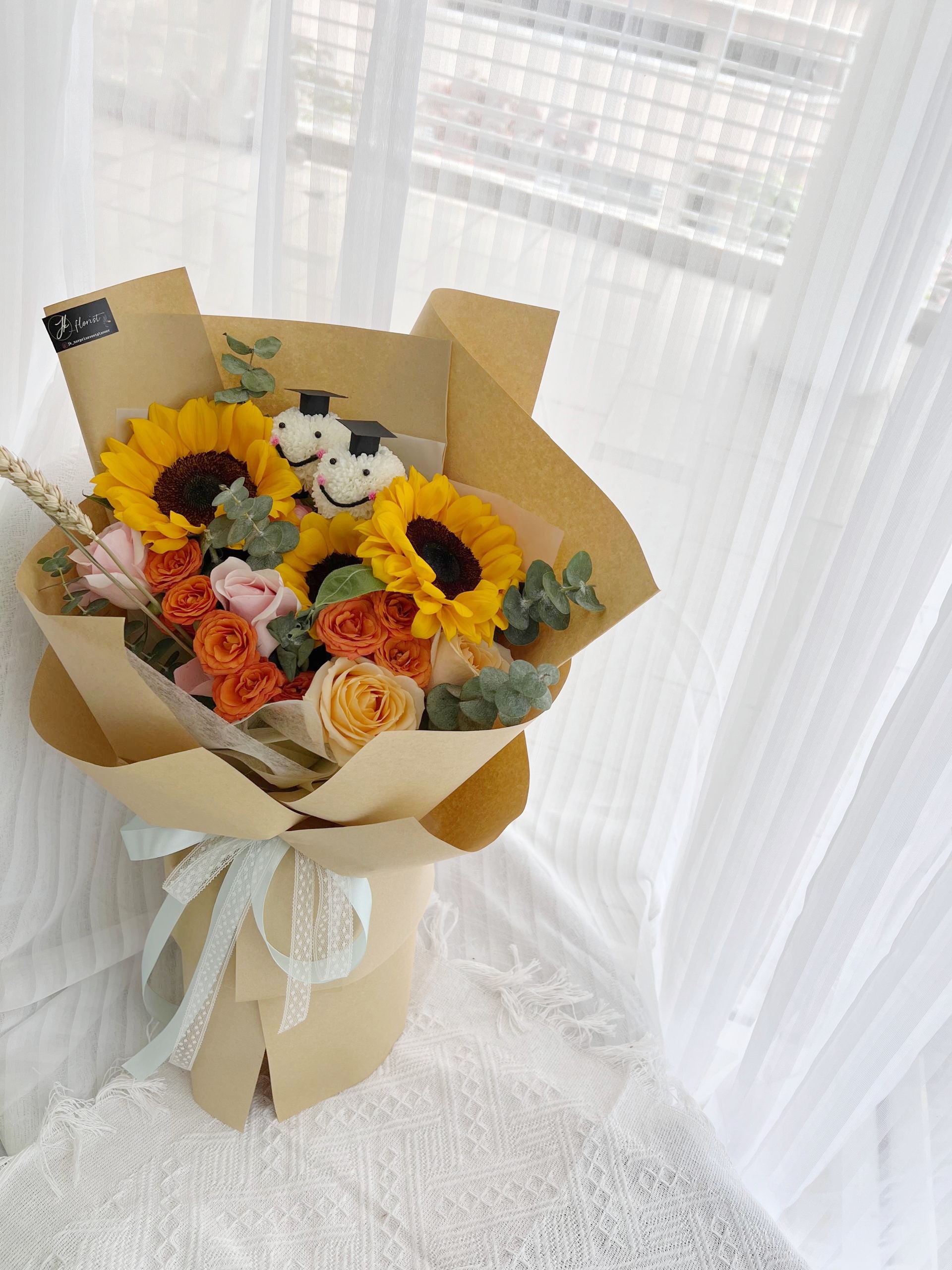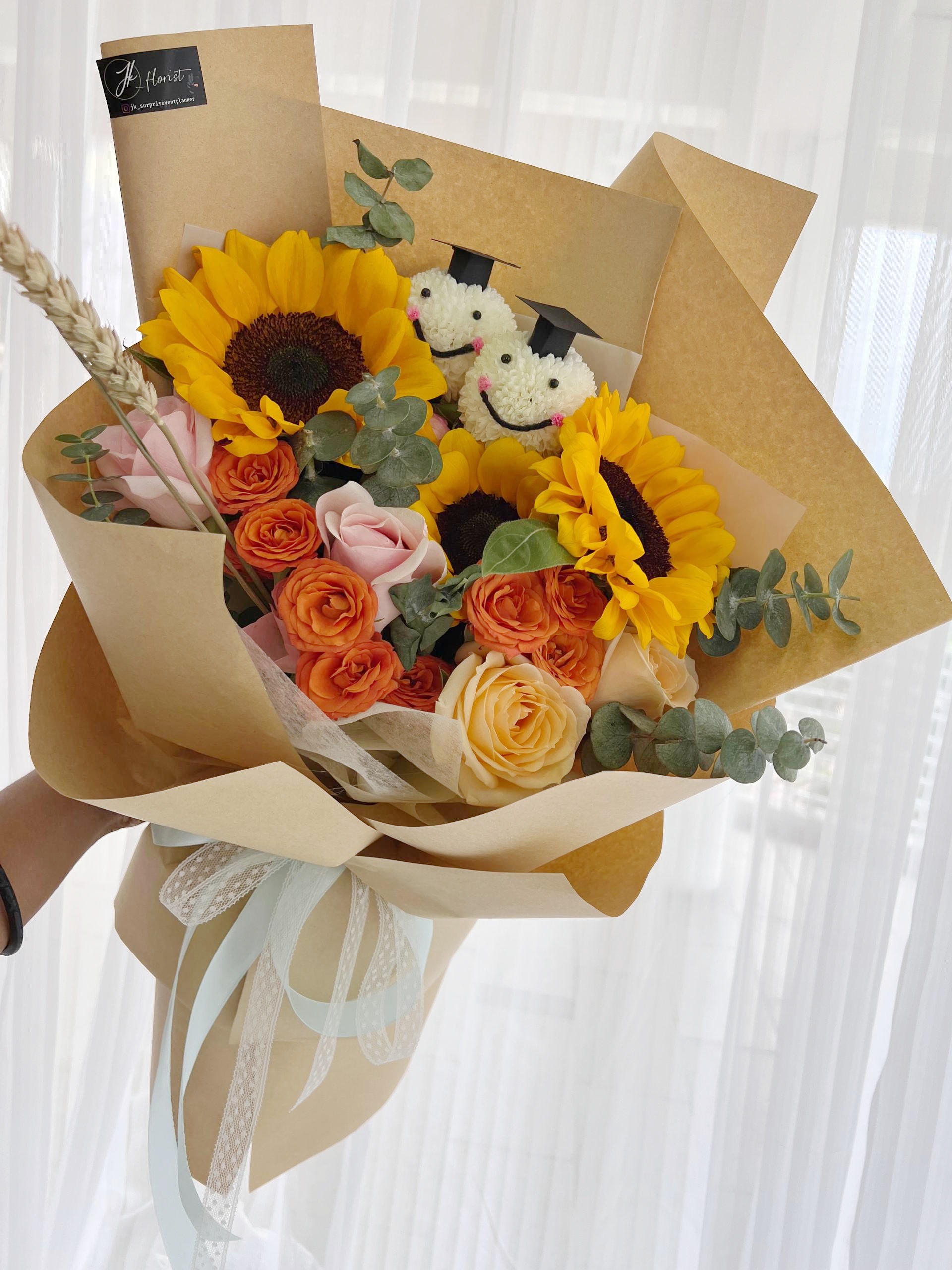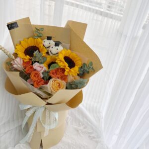 Medium : Sunflower (3 stalks), Sprayed Roses, Roses (5 stalks), Eucalyptus, White Chrysanthemums with Grad Cap (2 stalks)