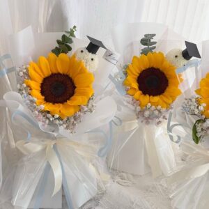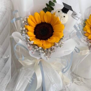Small : Sunflower (1 stalk), Sprayed Baby’s Breath, Eucalyptus, Ping Pong Chrysanthemum with Grad Cap